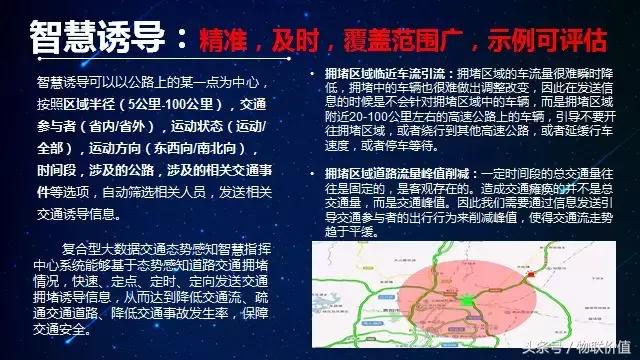 智慧誘導可以精準,及時的進行引流。用戶上路之后,如果收到一些信息,大部分人認為是無效的,但是實際上收到的信息對特定區(qū)域和特定人群是很有意義的。這里分為擁堵區(qū)域臨近車流引流和擁堵區(qū)域道路流量峰值削減。擁堵區(qū)域臨近車流引流指擁堵區(qū)域的車流量很難瞬時降低,擁堵中的車輛也很難做出調整改變,因此在發(fā)送信息的時候是不會針對擁堵區(qū)域中的車輛,而是擁堵區(qū)域附近20-100公里左右的高速公路上的車輛,引導不要開往擁堵區(qū)域,或者繞行到其他高速公路,或者延緩行車速度,或者停車等待。而擁堵區(qū)域道路流量峰值削減指一定時間段的總交通量往往是固定的,是客觀存在的。造成交通癱瘓的并不是總交通量,而是交通峰值。因此我們需要通過信息發(fā)送引導交通參與者的出行行為來削減峰值,使得交通流走勢趨于平緩。