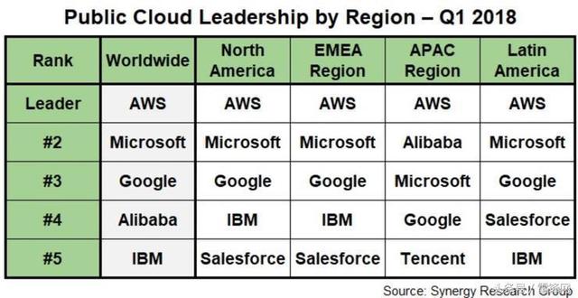 根據(jù)美國(guó)市場(chǎng)研究機(jī)構(gòu)Synergy Research Group發(fā)布的2018年一季度全球主要地區(qū)公有云廠商IaaS和PaaS收入排名,前五的是AWS、微軟、谷歌、阿里云和IBM,亞太地區(qū)的前五為AWS、阿里云、微軟、谷歌、騰訊云。