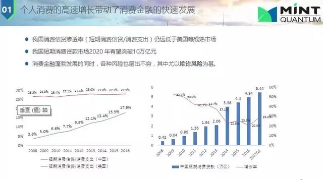 美國是個人消費實力很強(qiáng)的一個國家,我們以它為標(biāo)桿。圖中藍(lán)線代表中國,紅線代表美國。預(yù)測中國短期個人貸款到2020年達(dá)10萬億元,可見市場龐大。個人消費不僅僅靠大銀行,還要靠其他小型機(jī)構(gòu);因為大銀行本身這種特點(客群優(yōu)質(zhì)),很難下放到下層服務(wù)。在信用風(fēng)險中欺詐風(fēng)險在我國占的比例非常高,數(shù)額也比較大,經(jīng)常是有組織的欺詐,如做“網(wǎng)絡(luò)黑產(chǎn)”有百萬級人員,市場規(guī)模為千億級,很多公司被迫無法經(jīng)營,據(jù)估計,互聯(lián)網(wǎng)金融一半以上的壞賬風(fēng)險來自欺詐風(fēng)險。對比美國這方面比例就相對小的很多,如一個千億級個人消費,中能達(dá)20-30億美元,美國則只有幾千萬美元。原因有一點是美國征信做的比較好,幾乎覆蓋所有成年人。反欺詐就是提高欺詐的成本。