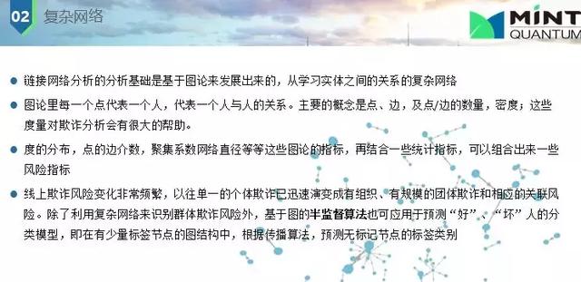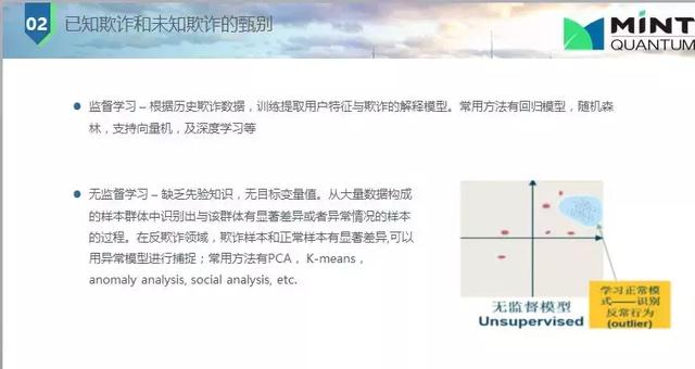 下面是欺詐與未知欺詐甄別問題,主要是監(jiān)督學(xué)習(xí)和非監(jiān)督學(xué)習(xí)。監(jiān)督學(xué)習(xí)是知道一個人以前欺詐(父母信息不對,電話號碼有誤等),我們就會打上標(biāo)簽,歷史數(shù)據(jù)就會訓(xùn)練我們的模型,統(tǒng)計模型所用數(shù)據(jù)大都都是有標(biāo)簽的;非監(jiān)督學(xué)習(xí)也是經(jīng)常使用的,因為欺詐是經(jīng)常改變的或不同特征的,我并不知道他是否是欺詐,我們用關(guān)聯(lián)網(wǎng)絡(luò),每個人間有聯(lián)系,這種網(wǎng)絡(luò)快速發(fā)展;還有一種是兩者結(jié)合起來,利用權(quán)重評估。