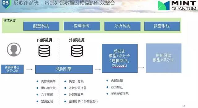 接下來講一下我們線上的一個反欺詐系統(tǒng)框架,下圖簡化了實際反欺詐系統(tǒng)。介紹了基本流程,首先是身份的交叉驗證,證明你是你。不光是銀行卡、手機(jī)、身份證交叉認(rèn)證,還有你的照片、活體認(rèn)證(你在上面動來動去);內(nèi)部數(shù)據(jù)和外部數(shù)據(jù)有一個決策引擎,這里面存儲了各種規(guī)則;接下就是一個評分分析系統(tǒng),這些數(shù)據(jù)有手機(jī)的行為數(shù)據(jù)也有其他外部數(shù)據(jù)(不可控,最好有個穩(wěn)定模型進(jìn)行備份);除此之外還有個預(yù)警系統(tǒng),對我們的模型進(jìn)行監(jiān)管,需要對實時數(shù)據(jù)進(jìn)行一些評估,這一點也是非常重要的。