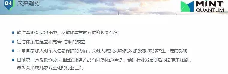 對未來一點展望,欺詐永遠(yuǎn)不會停止、不會消失,尤其在中國征信沒有完全建立,人口多,社會缺乏金融知識,對征信了解很少,收入差距比較大的環(huán)境下,欺詐現(xiàn)象會長期存在,這在風(fēng)控里面是考慮的一個重要部分。征信體系的建立和完善,雖然這個過程會很長;目前第三方反欺詐公司推出的服務(wù)產(chǎn)品有同質(zhì)化的特點,預(yù)計行業(yè)發(fā)展到后期會競爭加劇,最終會形成幾家專業(yè)化的行業(yè)巨頭。